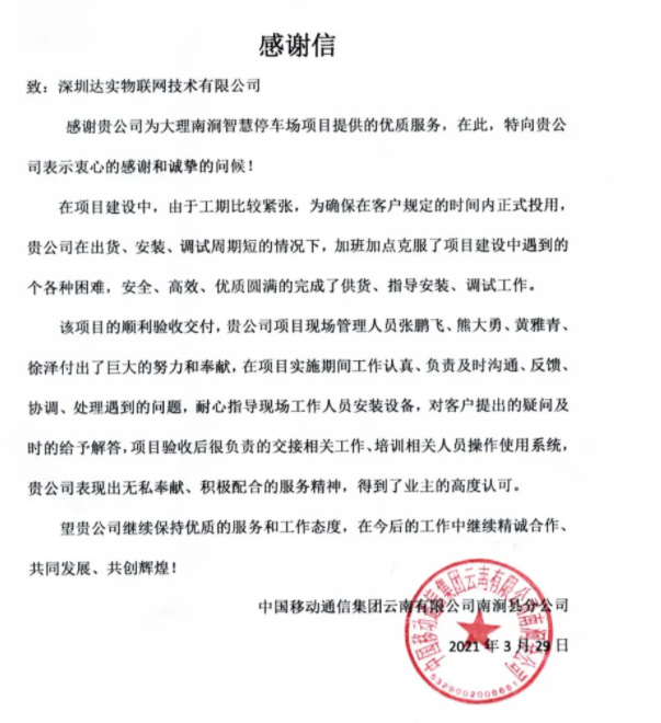 在本項(xiàng)目建設(shè)過程中,特別是在工期比較緊張的情況下,為確??蛻粼谝?guī)定時間內(nèi)使用,達(dá)實(shí)物聯(lián)網(wǎng)區(qū)域負(fù)責(zé)人帶領(lǐng)團(tuán)隊(duì)加班加點(diǎn),克服項(xiàng)目在建設(shè)中遇到的各種困難和問題,獲得了合作伙伴中國移動通信集團(tuán)云南有限公司對我司工作態(tài)度和優(yōu)質(zhì)服務(wù)的高度認(rèn)可,未來,我們也將繼續(xù)不忘初心,延續(xù)這份期望與肯定,為客戶提供更優(yōu)質(zhì)的服務(wù)!