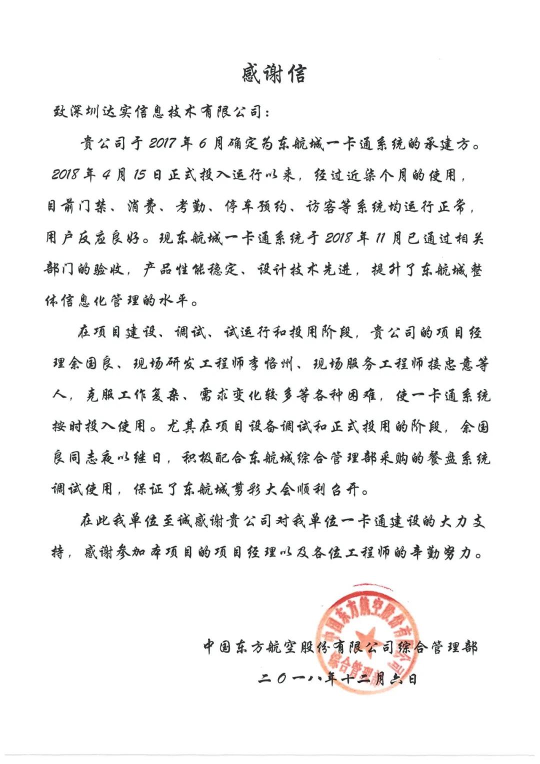 C3物聯(lián)網(wǎng)身份認(rèn)證系統(tǒng)已在東航企業(yè)穩(wěn)定運(yùn)行超過5年,期間不斷增補(bǔ)新產(chǎn)品、服務(wù)蔓延至全國各基地,經(jīng)受著11萬東航人對我們的檢驗(yàn)。從員工上下班的日常工作生活,到福利政策的便利實(shí)施,系統(tǒng)已獲得來自東航員工的好評(píng)。早在18年我們就已經(jīng)收到了來自東航企業(yè)的感謝信,這封感謝信也是對達(dá)實(shí)物聯(lián)20余年開發(fā)經(jīng)驗(yàn)的肯定。