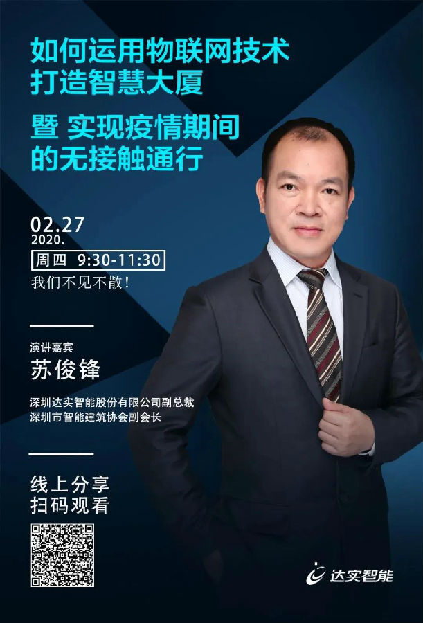 深圳達實智能股份有限公司副總裁,深圳市智能建筑協(xié)會副會長蘇俊鋒將會基于達實大廈的實際應用,在線上與大家一同分享《如何用物聯(lián)網技術打造智慧大廈》,并對以上問題做專業(yè)解答。