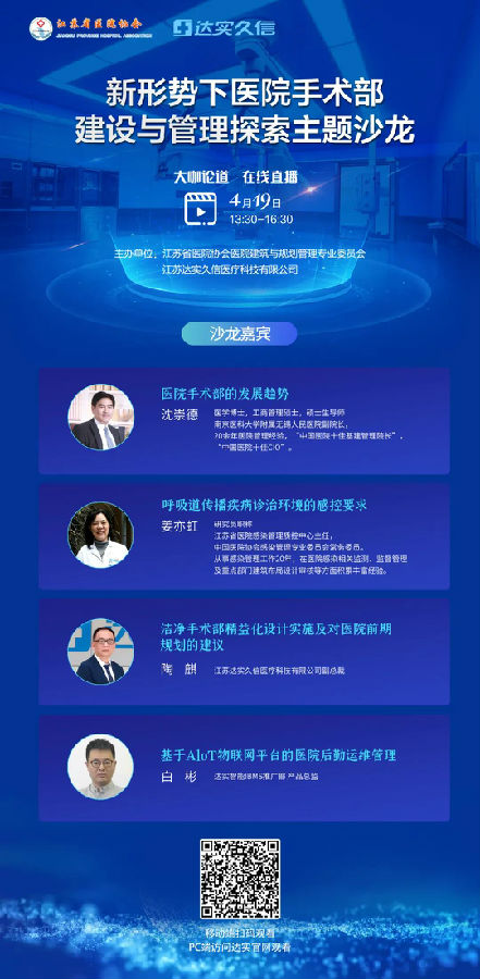 4月19日 13:30-16:30,達實智能旗下全資子公司達實久信聯(lián)合江蘇省醫(yī)院協(xié)會醫(yī)院建筑與規(guī)劃管理專業(yè)委員會,邀請十多位相關(guān)醫(yī)療領(lǐng)域的專家、大咖,共同舉辦醫(yī)療行業(yè)主題沙龍:【新形勢下醫(yī)院手術(shù)部建設(shè)與管理探索】,與大家共同探索醫(yī)院手術(shù)部建設(shè)的當下與未來。