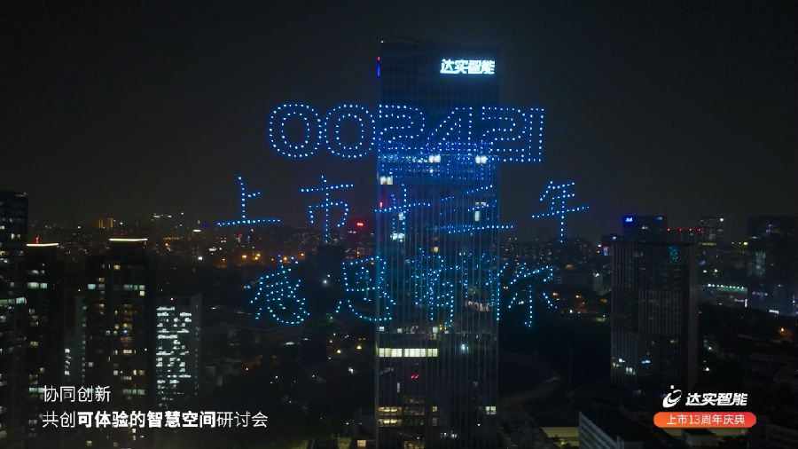 一場獨具特色的無人機燈光秀在夜間震撼上演,數(shù)百架無人機環(huán)繞達實大廈飛行,配合達實大廈的燈光效果,用光影呈現(xiàn)出達實AIoT智能物聯(lián)網(wǎng)管控平臺、AI人臉識別終端、達實大廈手機APP等物聯(lián)網(wǎng)技術(shù)產(chǎn)品。上市13周年,感恩有你!