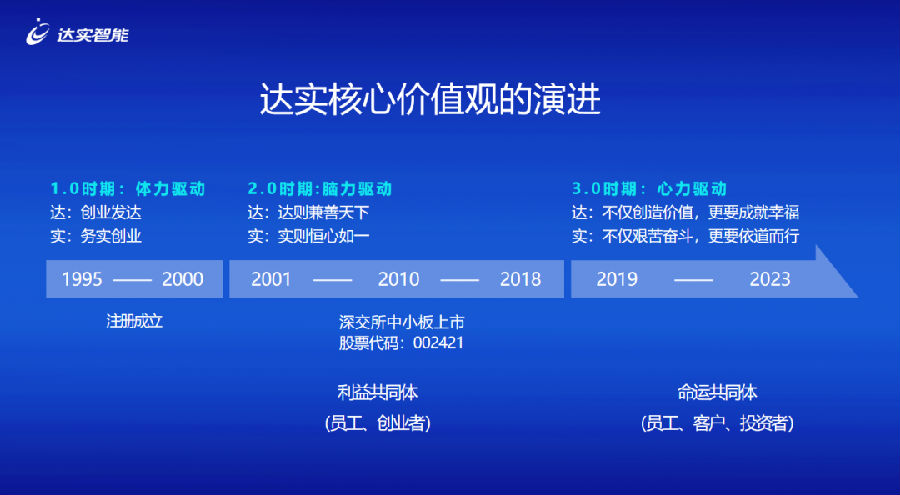 如果說人生成長可以總結(jié)為“心-道-德-事”四部曲,那么企業(yè)成長的四部曲就對應(yīng)著“使命-哲學(xué)-戰(zhàn)略-機(jī)制”,它與西方流行的IBM公司的企業(yè)領(lǐng)導(dǎo)力模型(領(lǐng)導(dǎo)力-價(jià)值觀-戰(zhàn)略制定-戰(zhàn)略執(zhí)行)相吻合。達(dá)實(shí)如何尋找到自己的企業(yè)使命?我們首先探索所從事的物聯(lián)網(wǎng)技術(shù)的本質(zhì)是什么。有人說物聯(lián)網(wǎng)鏈接萬物,有人說控制萬物,還有人說要改造萬物。我思索下來,最終在圣賢思想中找到了答案,王陽明說:“夫圣人之心,以天地萬物為一體?!蔽矣纱烁形颍?/span>物聯(lián)網(wǎng)的本質(zhì)是喚醒萬物!人和萬物是平等的,讓萬物與人類產(chǎn)生鏈接,從而激發(fā)人們在各種建筑空間當(dāng)中的潛能。由此我們找到了達(dá)實(shí)智能的企業(yè)使命:萬物智聯(lián),心心相通。我們要為人們營造更智慧、更低碳、更溫暖的工作生活空間。到2030年,我們的愿景是智慧百萬空間,溫暖億萬用戶。這就是我們?yōu)橹袆訛橹度氲钠髽I(yè)成長原動力。企業(yè)哲學(xué)最核心的部分就是核心價(jià)值觀。對于達(dá)實(shí)而言,創(chuàng)業(yè)最初的5年中,我們心中所想就是老實(shí)誠實(shí)地創(chuàng)造物質(zhì)財(cái)富,改變自己的生活狀態(tài);5年后我們把“達(dá)實(shí)”二字加以升級,“達(dá)則兼善天下”來源于孟子,“實(shí)則恒心如一”源自于《菜根譚》。這一階段從2001年成長到2010年,我們登上了資本的市場。