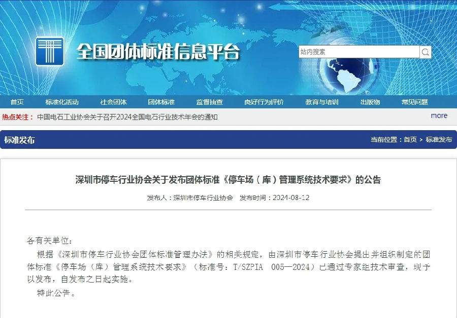 2024年8月9日,團(tuán)體標(biāo)準(zhǔn)《停車場(庫)管理系統(tǒng)技術(shù)要求》(T/SZPIA 005—2024)(以下簡稱“本標(biāo)準(zhǔn)”)正式發(fā)布,自發(fā)布之日起正式實(shí)施。
