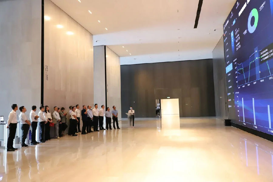 (來訪嘉賓參觀達(dá)實物聯(lián)網(wǎng)科技展示中心)接著,大家來到達(dá)實大廈的節(jié)能“心臟”——無人值守超高效冷站機房參觀。機房占地面積450平方米,滿足總面積10萬平方米的達(dá)實大廈的供冷需求,使用了達(dá)實自主研發(fā)的EMC007中央空調(diào)節(jié)能控制系統(tǒng),并結(jié)合達(dá)實自主研發(fā)的AIoT物聯(lián)網(wǎng)智能管控平臺,全年綜合制冷能效系數(shù)SCOP達(dá)到6.38。