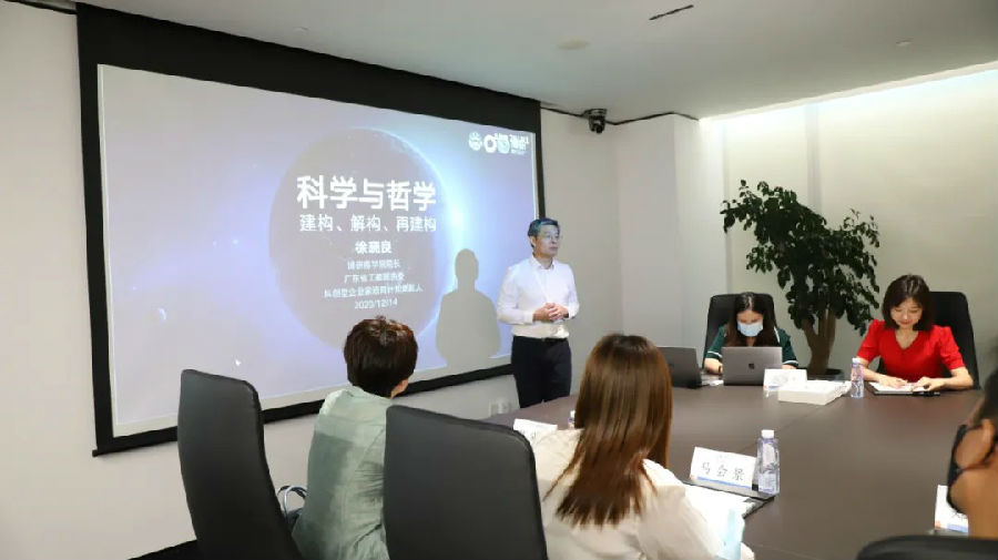 參觀結(jié)束后,嘉賓們在達(dá)實智能進(jìn)行座談交流。博研商學(xué)院徐曉良院長以《科學(xué)與哲學(xué)》為主題與大家進(jìn)行分享,同時他談及:“企業(yè)家的精神,就是要尋找前進(jìn)的動力在哪里。企業(yè)家需要具備永遠(yuǎn)追逐的精神,點亮自己照亮別人,關(guān)鍵點在于點亮自己。”
