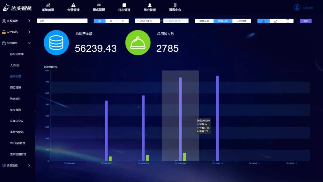 達(dá)實(shí)大廈基于AIOT物聯(lián)網(wǎng)管控平臺來實(shí)現(xiàn)整棟大廈的全生命周期可視化管理。消費(fèi)環(huán)節(jié)也不會(huì)放過,從食堂的客流到消費(fèi),平臺分時(shí)份層地管理每一層每一個(gè)檔口的消費(fèi)情況。提供最準(zhǔn)去的數(shù)據(jù),幫助食堂運(yùn)營人員合理分配餐品,減少供應(yīng)過?;蚬?yīng)不足的情況。