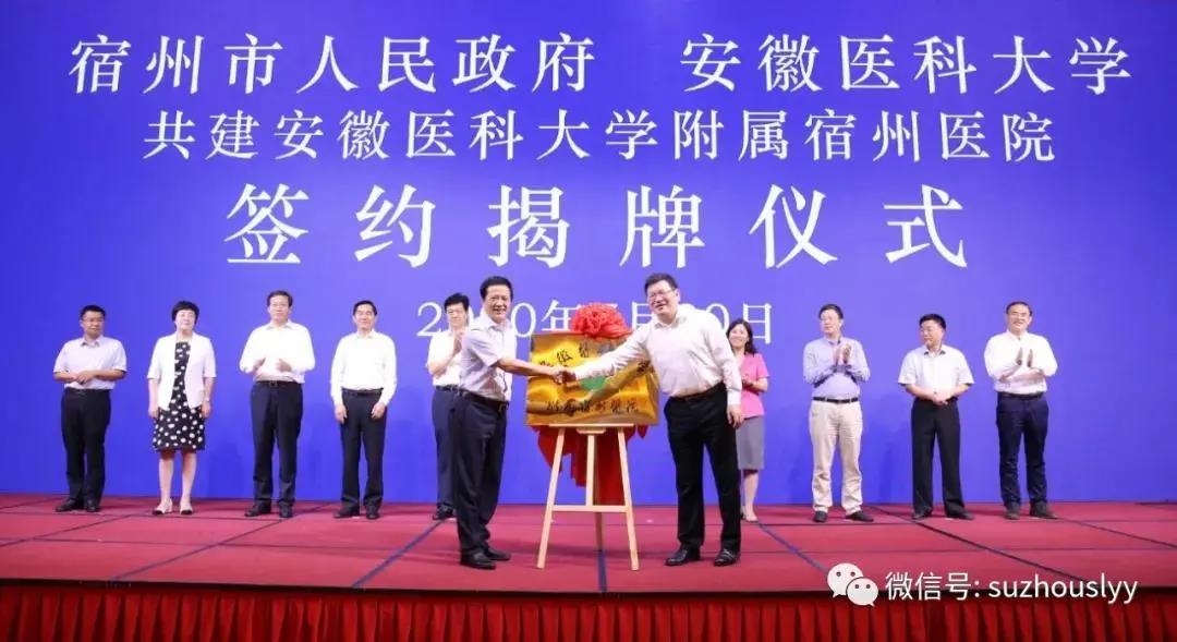 7月30日,安徽醫(yī)科大學附屬宿州醫(yī)院簽約揭牌儀式隆重舉行。安徽醫(yī)科大學黨委書記顧家山、校長曹云霞及其直屬附院專家團隊,宿州市委書記史翔,宿州市委副書記、宿州市人民政府市長楊軍及市委、市政府相關(guān)部門領(lǐng)導出席儀式,宿州市立醫(yī)院領(lǐng)導班子全體成員、相關(guān)科室負責人、醫(yī)務(wù)及行管人員代表300余人參加簽約揭牌儀式。