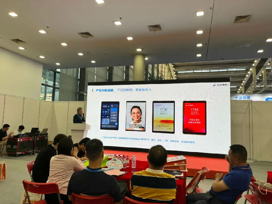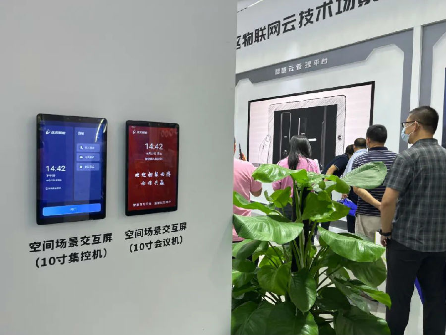 在空間場景控制系統(tǒng)展區(qū),觀眾可以體驗到:一塊空間場景交互屏既可以作為人臉識別屏用于門禁考勤;也是一個設(shè)備集控屏,可以控制所關(guān)聯(lián)場景中的各種空調(diào)、燈光、窗簾等設(shè)備;它同時也是一個信息發(fā)布屏,用戶可以通過手機直接在這個屏幕上推送信息,比如給客戶的歡迎詞等等。三屏合一的創(chuàng)新,把一個看似普通的門禁屏,升級為人和空間交互的窗口。